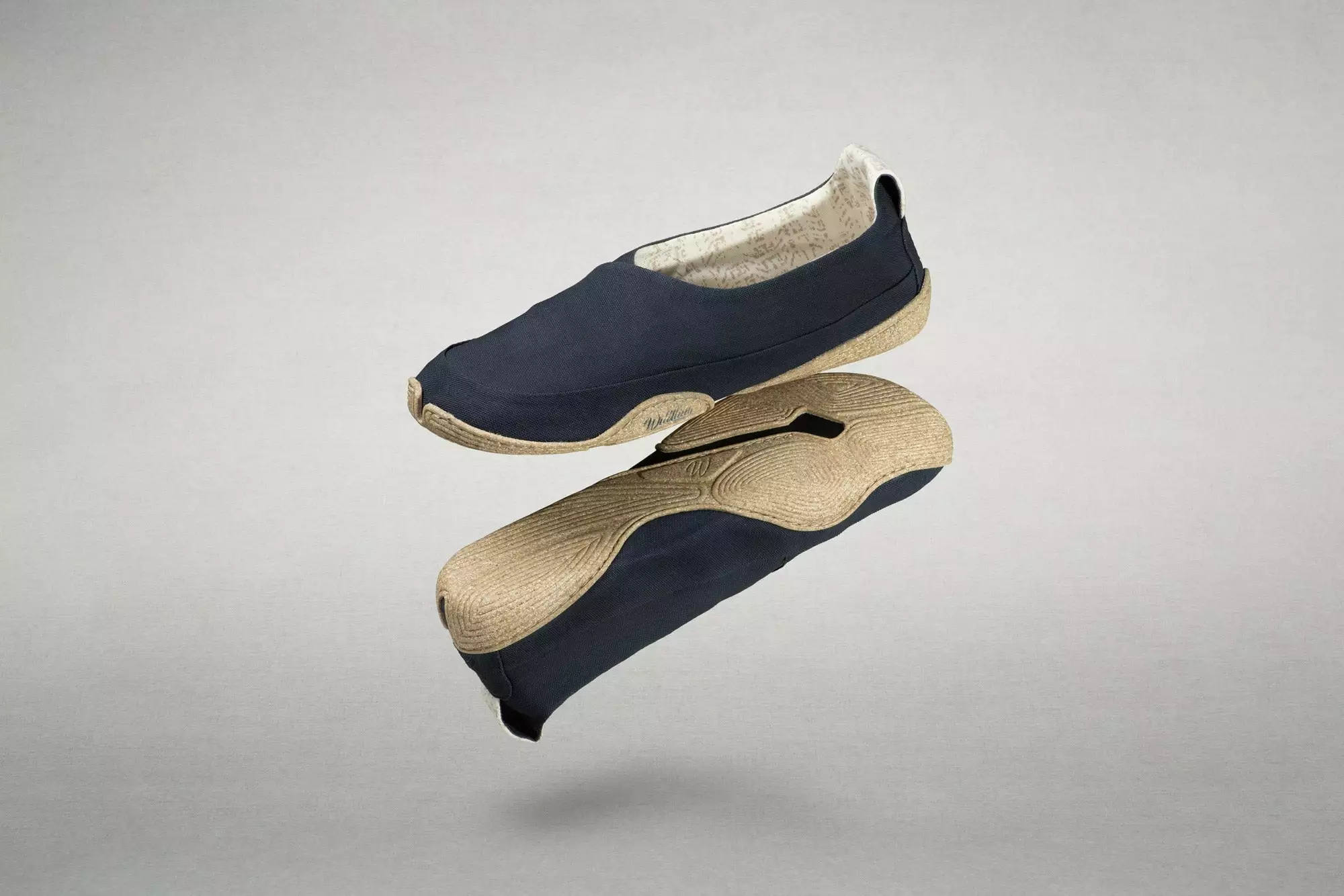 Das unisex Design kommt ganz ohne Mikrofaser aus. Der Oberstoff aus Washi scheint wie um den Fuß herum gelegt.